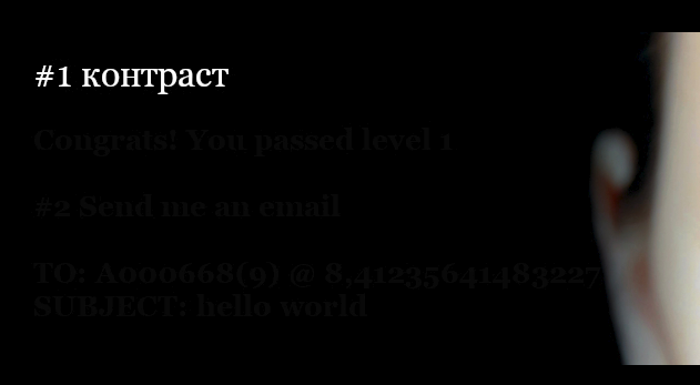 The hidden message contained another riddle: Congrats! You passed level 1 #2 Send an email TO: A000668(9)@8,41235641483227 SUBJECT: hello world
